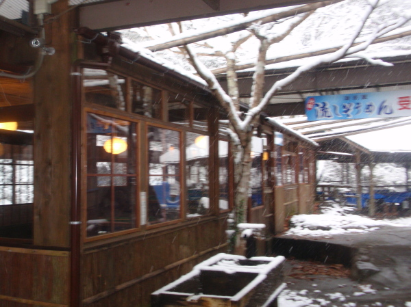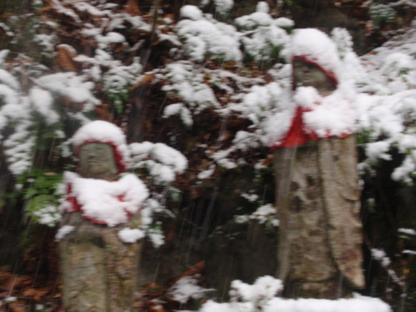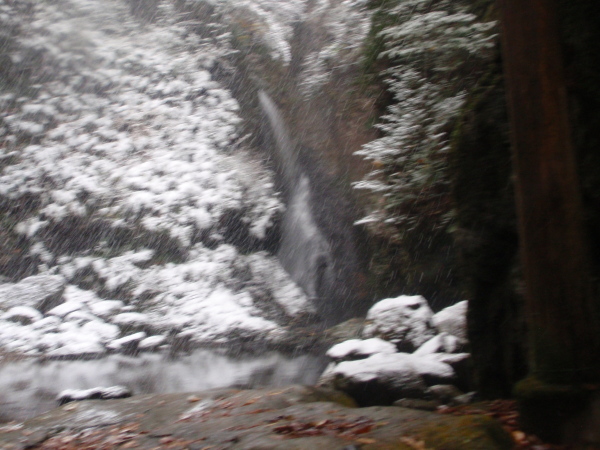 ・・・・・・郡上地方に初雪が降りました。降りしきる雪の釜ケ滝、初めて来たという関市のお客様は、寒さに震えながら、「近くにこんな良い所があったんだね」と興奮気味。行者の滝のお地蔵さんも雪化粧。夏には、流しそうめんでにぎわった滝茶屋も冬眠に向けて、水道関係の蛇口を外したり、トイレを閉めたり、きれいにかたずけました。来年の春まで冬季休業に入ります。
